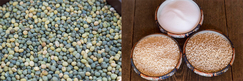 味噌作りの主な材料がこちら。写真左/白い大豆と青豆と呼ばれる甘みの強い大豆。写真右/塩(上)、麦麹(左下)、米麹(右下)。