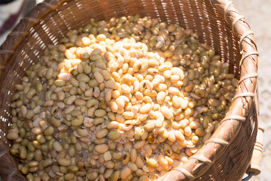 「普通の白い豆と青い豆の二種類あるでしょ。この青い豆を入れるのが大事なの。青い豆は甘くて美味しいから。食べてみて」