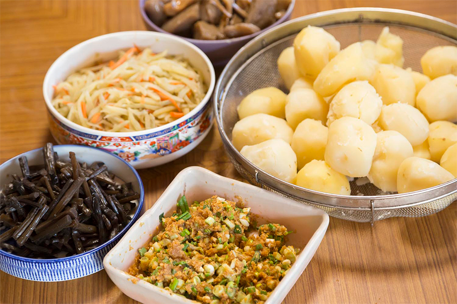 右から時計回りにジャガイモ、ネギを混ぜた民宿・山水館の家味噌、ふきの煮物(きゃらぶき)、ヤーコンのきんぴら、こんにゃくの煮物。すべて自家製だ。