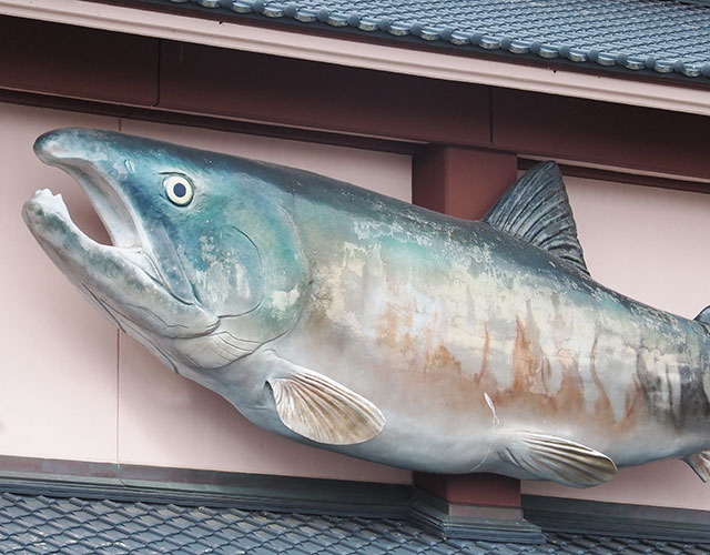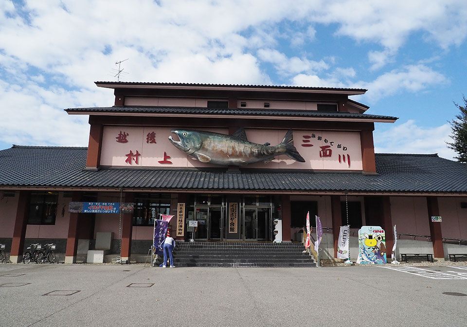 日本初のサケ博物館であるイヨボヤ会館。江戸時代の種川制度や村上のサケ文化、三面川のサケの一生について学ぶことができる。ブナ毛の出た巨大なサケの看板は迫力満点!