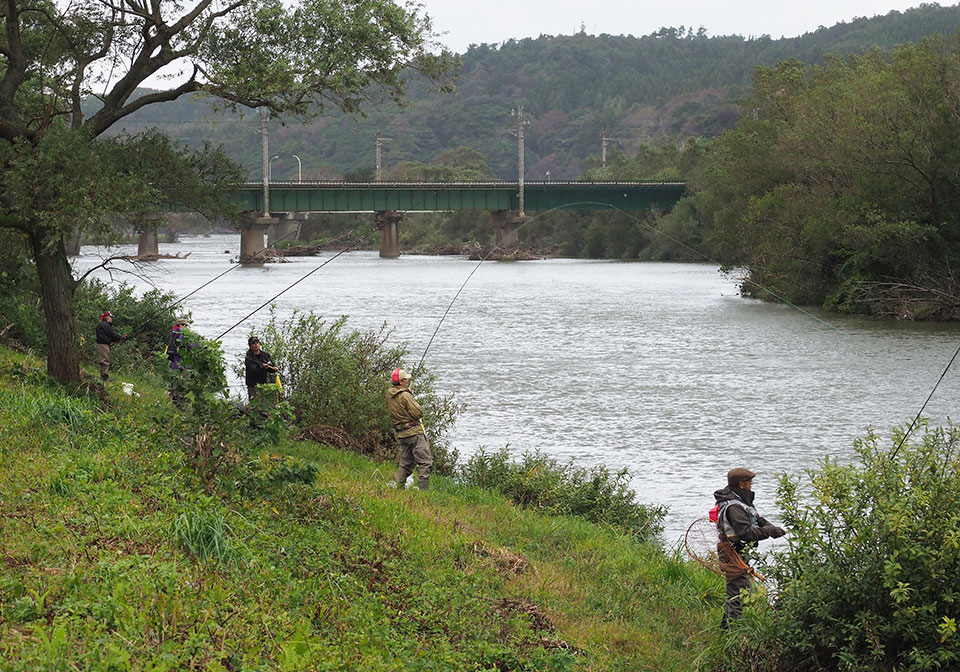 雨上がりの翌日。釣りはせずに川を見て回る。まず、釣り区間の最上流に設置されているウライを見に行く。数人の作業者が柵にかかったゴミを取り除き、魚が入り込む箱状の罠の状態を確認している。「ああ、三面川のサケは、これ以上は溯上することができないのか……」。そう思うと、少し複雑な気持ちになった。その間で釣りをさせてもらっていながら勝手な話なのだけれども。