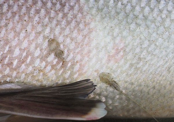 赤紫のブナ毛が薄っすらと腹を染める。寄生虫のシーライスが川に入って間もないことを示している