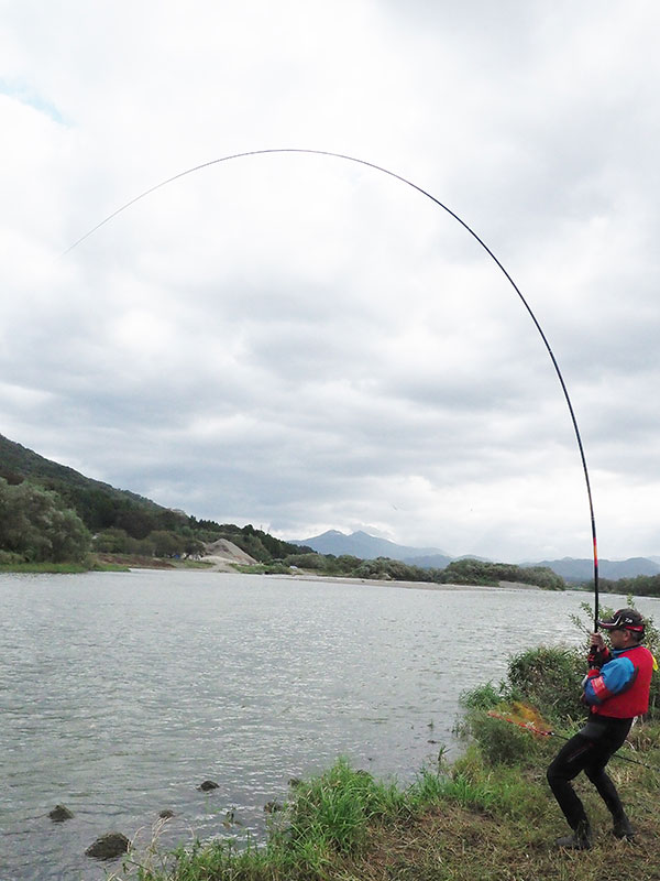 餌釣りの人がサケをかけた。リールを用いない一本竿でのスリリングなやり取りが、たまらない魅力なのだという