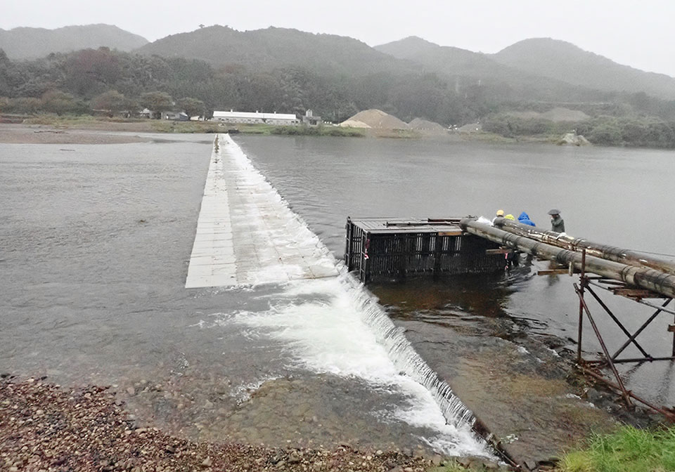 河口から3kmほどの所に設けられたウライ。川幅いっぱいに設けられた柵で、遡上してきたサケは柵に導かれるように手前の箱型の罠に入る。後述するが、まだ漁期前だったため、サケは柵を立てていないウライを飛び越えて遡上できる状態だった
