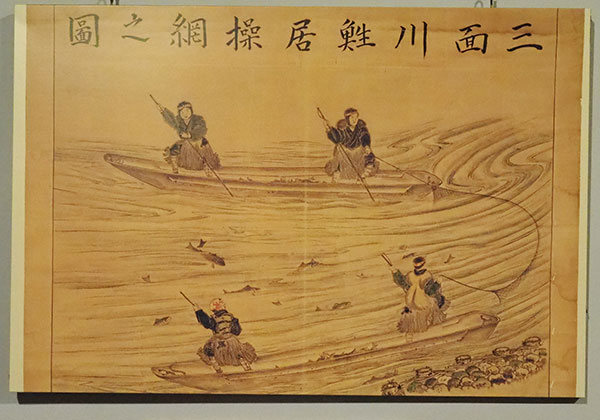 伝統漁法である居繰り網漁が描かれた図。川側にあるイヨボヤ会館に展示されている