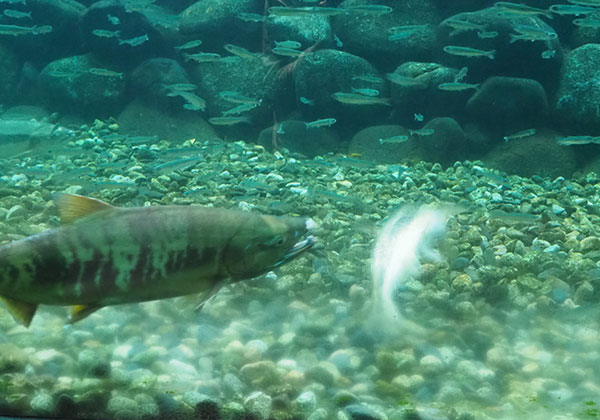 イヨボヤ会館の大型水槽ではサケの産卵行動を観察することができる。後ろにいる小魚は昨年、この水槽で生まれたサケの幼魚
