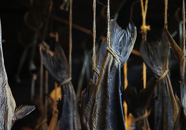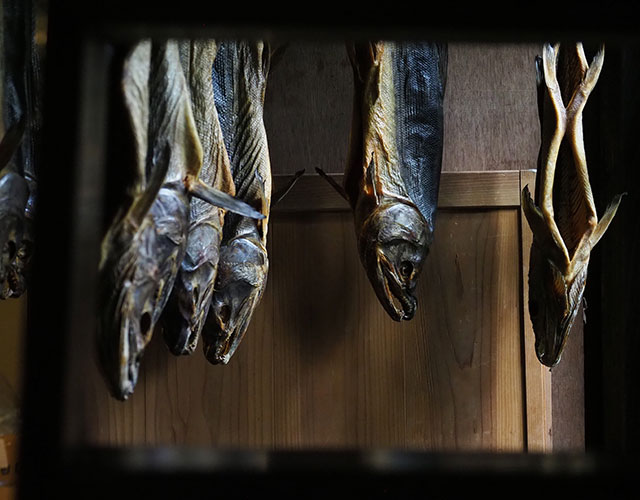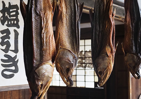 一例を紹介すると、漁獲したサケの内臓を取り除き、塩をあてて3日間ほど寝かせた後に塩を洗い流して水の中で半日ほど塩を抜く(この加減で塩気を調節する)。その後は尾をひもで縛って軒先に吊るし、冷たい海風に数週間さらすことで乾燥させていく。その間にタンパク質をアミノ酸に変える発酵・熟成が進み、特有の深い味わいが醸成されていく、というわけだ。10~11月に盛んとなる漁期に獲ったサケは塩引きにされ、正月には食べられる。塩をあててから干すという意味では北海道のトバにも似るが、トバに比べて長期間干してもしっとりとした身の状態が保たれるには、村上の冷たくも適度に湿気を含んだ冬の風が必要だという。