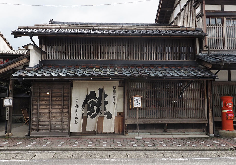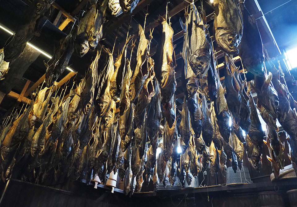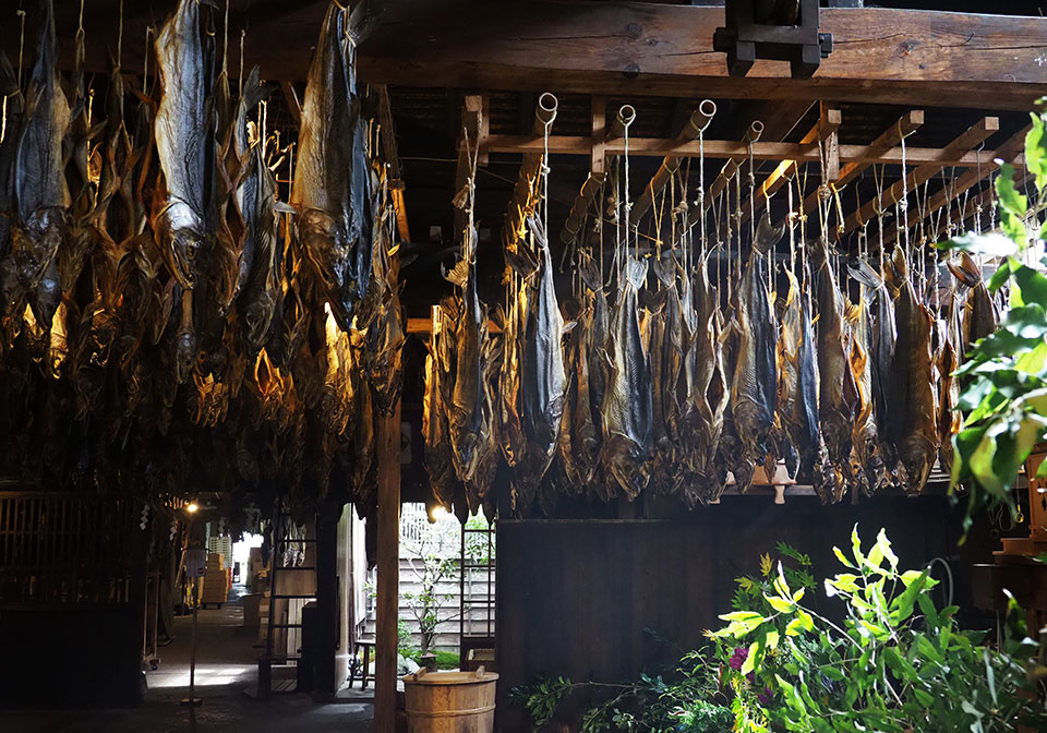 軽い足取りで向かう先は「千年鮭・きっかわ」。村上の鮭食文化を語る際に外せない「塩引き鮭」や「酒びたし」など鮭製品の販売を行いながら、店の奥間では天井に尾をひもで結ばれた鮭がずらりと吊るされた様子を観察できる。