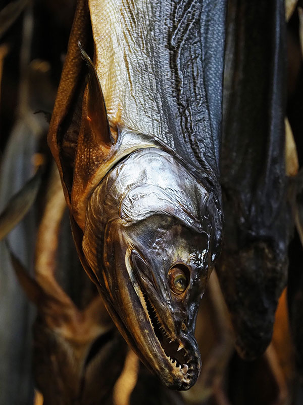 「鼻曲がり」と呼ばれる川ザケ特有の二次性徴による、いかつい顔が天井から迫る。きっかわでは多分に展示的な意味合いもあるだろうが、漁期である秋からお正月にかけては軒先に鮭を吊るしている民家も多く、冬の風物詩となっている。