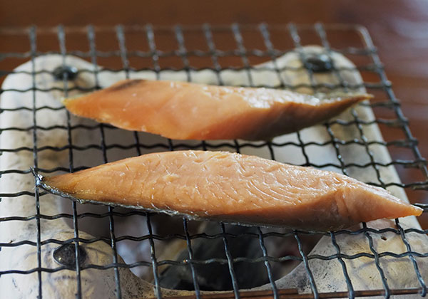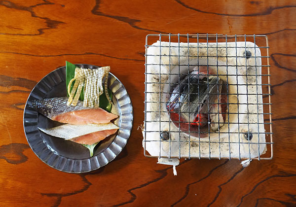 細く引かれた川サケの厚い皮は、炭火であぶると、くるりと反り上がってくる。それを口の中に放り込むと、柔らかいスルメのような歯ごたえとともに、これぞ川の鮭と思わしき香ばしさが広がり、鼻を抜ける。サケは川に入ると体表にブナの木肌色が浮かび上がる。と同時に皮は鱗が埋まってしまうほどに厚みを増してくる。そんな二次性徴の進んだサケは「ブナ毛」と呼ばれ、栄養分を卵や精巣に回してしまうため、海で獲れる銀ピカなサケに比べると、身の脂は落ちてしまいがちだ。それゆえに「川の鮭は海の鮭に比べて食味が落ちる」なんて声もある。