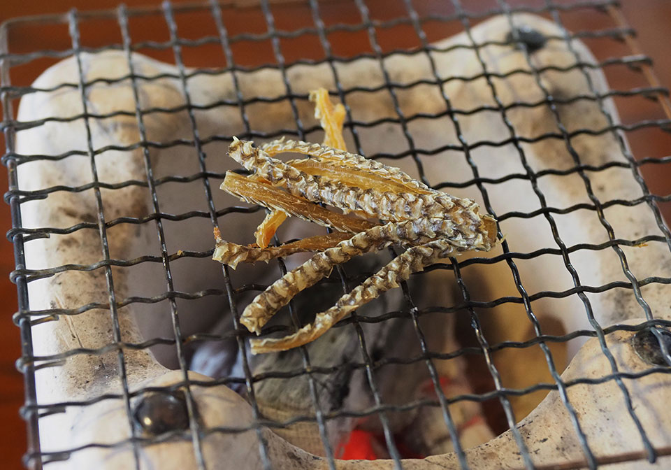 味の詳細は食レポ下手な筆者による文字の羅列で知るよりも、ぜひ村上に吹く風を感じながらご自分の舌で味わってほしい。ひとつだけ、最も心に残った料理だけ紹介したい。それは酒びたし皮のおどり焼きだ。