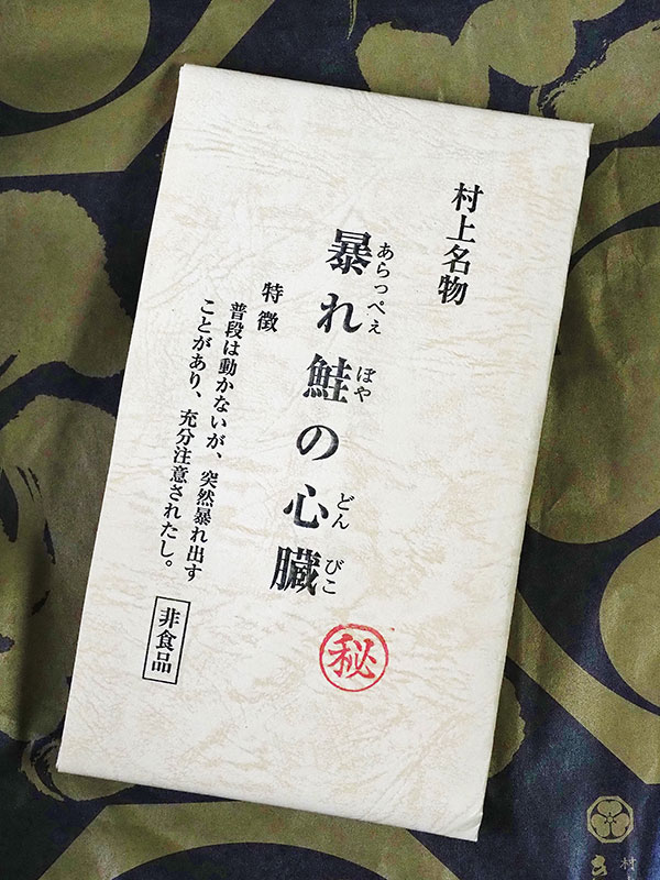 井筒屋で鮭づくしのお料理をいただく予定の私は、それでもきっかわで何か買いたいと迷ったあげく、紙袋に包まれた村上名物「暴れ鮭の心臓(あらっぺぇぼやのどんびこ)」というお土産をひとつ買った。袋には特徴として「普段は動かないが、突然暴れ出すことがあり、充分注意されたし」とある。