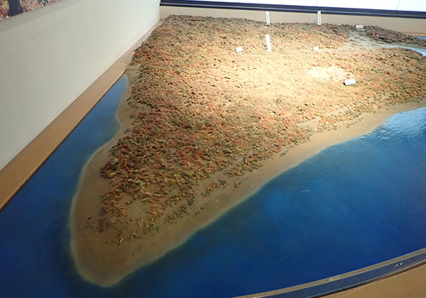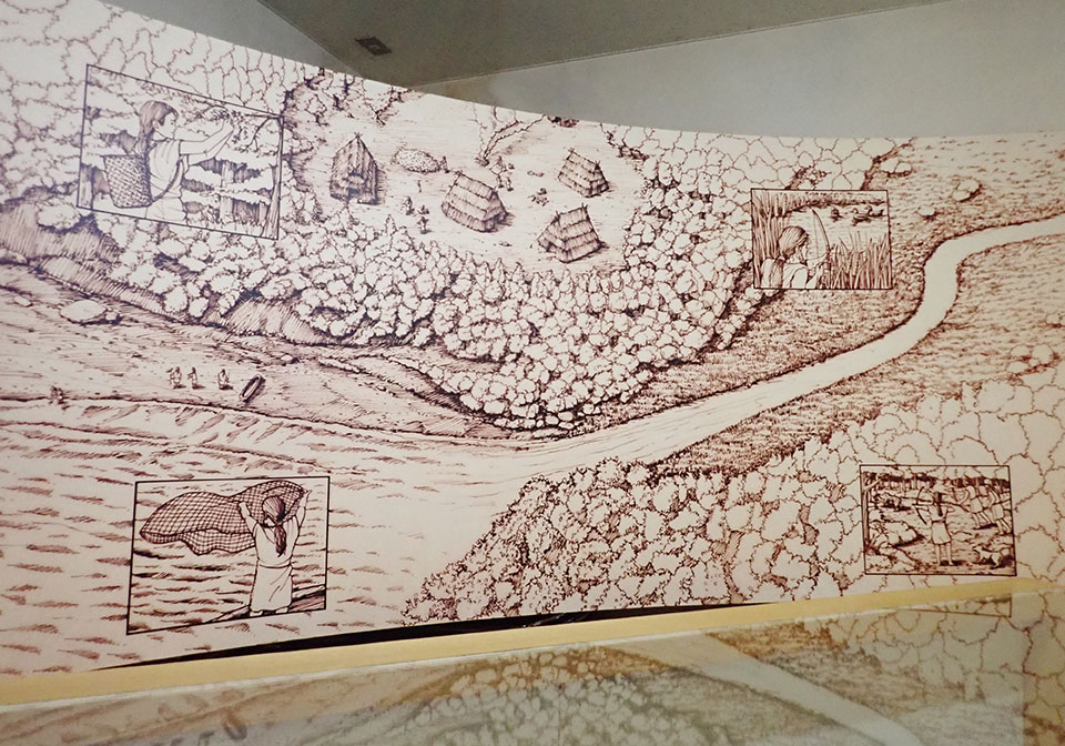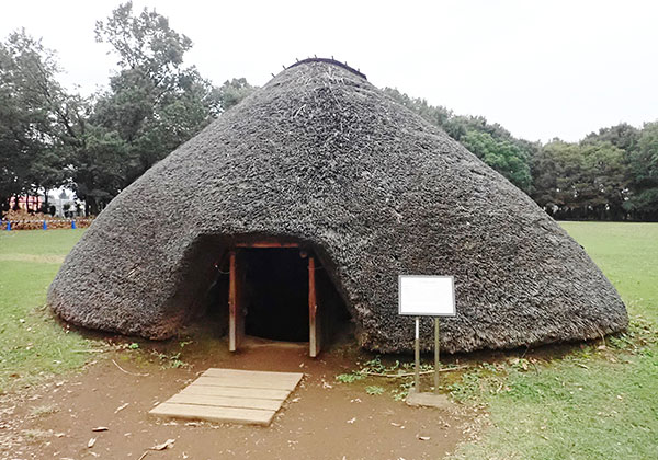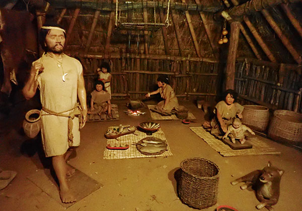 公園の広場には復元された竪穴式住居があり、そこには縄文時代の一家が住んでいる。親子がくつろぐ居間の一角では直火が炊かれ、その上には縄文土器が備えられている。何かをぐつぐつと煮ているのは母だろうか姉だろうか。犬も寝そべる一家団らんの中、外に出かけようとする男はこの家の長だろう。肩には一本の釣り竿が掲げられている。釣りは、この時代からあった。