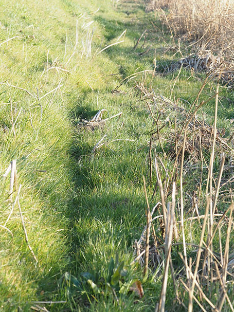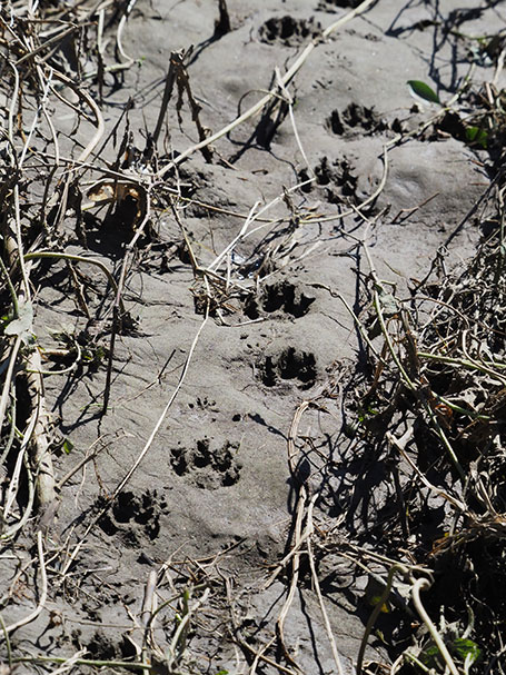 だが、足跡というものは、その主なくしても存在を明確に主張する。足跡を気にするようになった今では、常にタヌキの存在を感じて、この川を歩けるようになった。川と田畑を線でつなぐように土手をまたぐ、ささやかなケモノ道。その存在を知り、ケモノ道の途中には溜めフン場も見つけた。タヌキやイタチは、さほど多くない川沿いの柳の木をランドマークにしているようで、その周囲には、いつも足跡が散らばっていた。