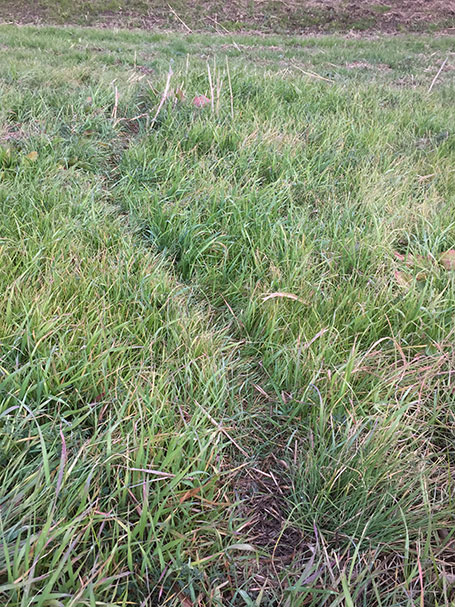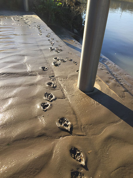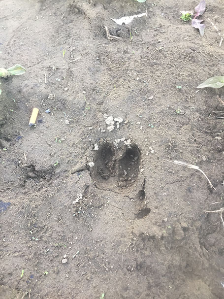 私は騒ぎのおさまった現場を離れると、イノシシがそこに至るまでの道筋を考えた。住宅地の舗装道を走り回っていたら、さすがに騒ぎになるはずから、おそらくルートは川だろうと思い、その朝にイノシシが足早に駆け抜けたであろう道のりを逆方向にたどった。しばらく探すと、特徴のあるひづめの跡を見つけることができた。
