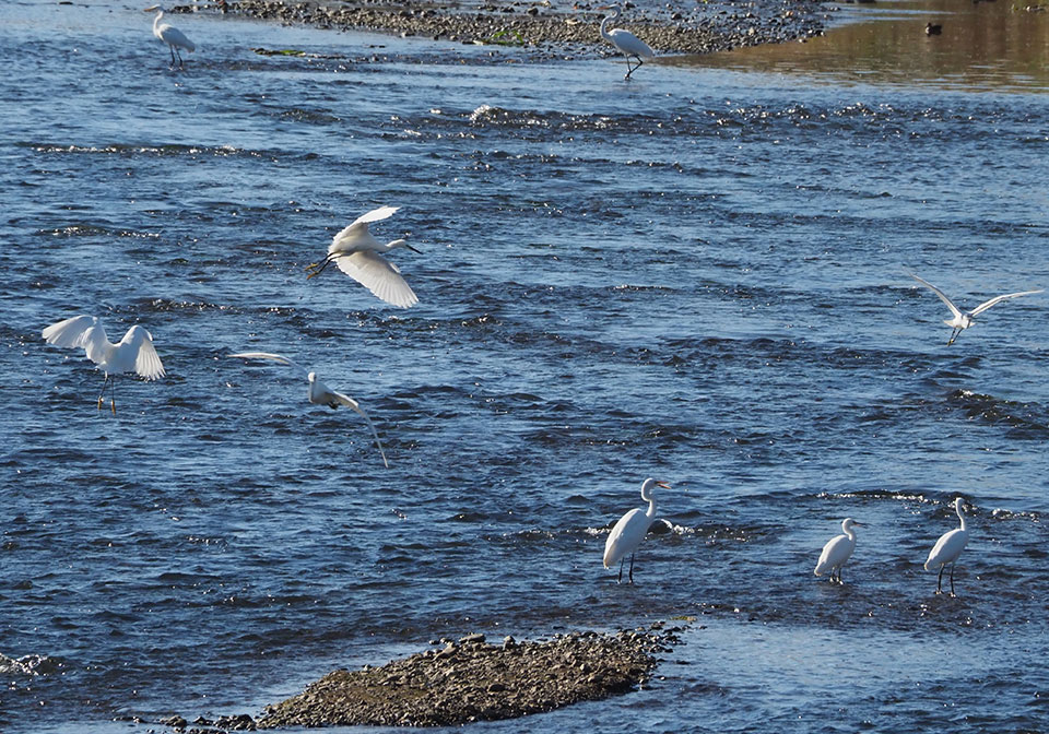 つい先日、これまで見たことのないものすごい光景を見た。それはカワウとサギ類が一緒になって行う集団狩りだ。川幅いっぱいに広がった20羽ほどのカワウが一斉に流れを下りながら魚の群れを下流の浅瀬へと追い詰める。先回りしたコサギやチュウサギ、アオサギが、それを待ち構える。逃げ場を失った小魚たちは一度にどのぐらいの数食べられてしまうのだろう。