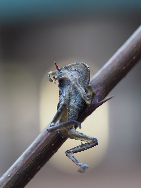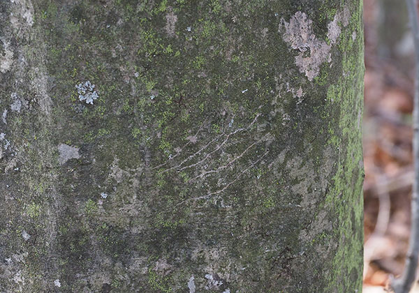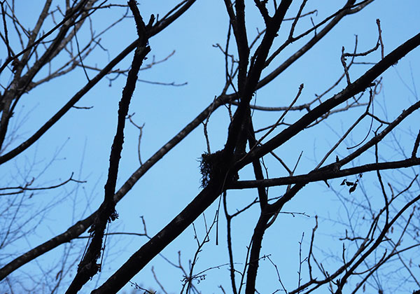 歩きはじめて早々、西さんは林道に繁茂するトゲだらけのハリエンジュにモズのハヤニエを見つけた。さらに冬枯れた木の枝の樹皮がずるりと剥かれているのを見つける。