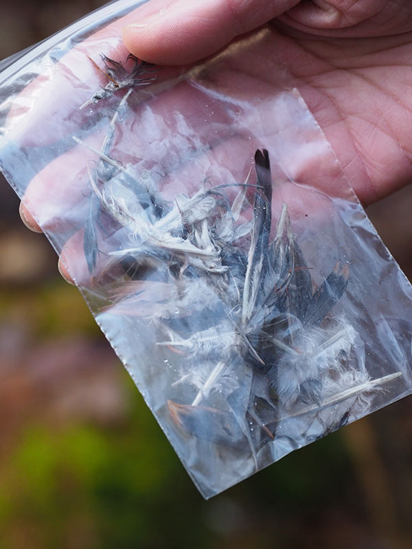 西さんが毛鉤用に鳥の羽を得ている機会は大きくはふたつ。ひとつはこのキジバトのように猛禽に襲われた食痕からいただく場合。もうひとつはロードキル(車道での轢死や衝突死)により命を絶たれた鳥からだ。さらに使い終わった古い巣からも巣材である羽やシカの毛などが得られるし、ねぐらの下に落ちている羽を拾うこともある。そして状態の良い死骸は持ち帰り、仮剥製として保管する。西さんは野鳥の研究者、フィールドワーカーなのだ。