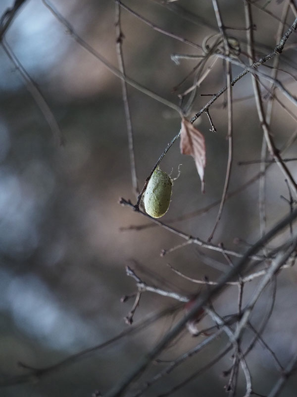 落ち葉が積もる遠目の川原にアオシギを探し、足元に鳥の羽(食痕)を探しながら、もうひとつ葉の落ちた枝に探しているものがあった。それはヤママユのマユである。