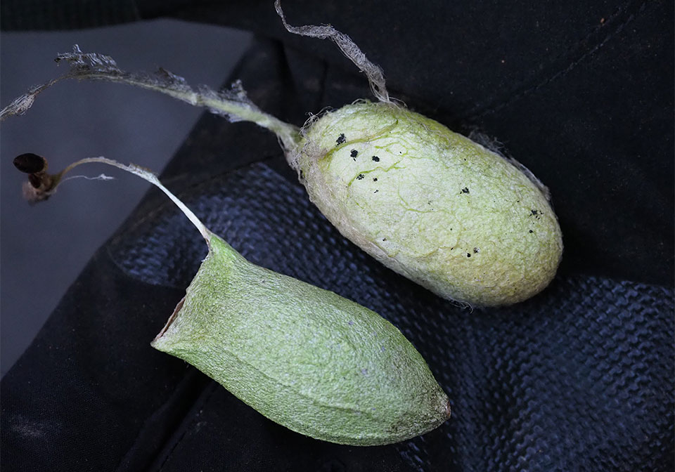 釣り糸はその昔「テグス(天蚕)」が用いられたが、それこそヤママユの仲間であるテグスサンという蛾の絹糸腺(糸を作る器官)から作られていた(ナイロンラインをテグスと呼ぶのはその名残)。だが何も毛虫の体から取り出さなくてもマユをほどけば細くしなやかで強い糸を紡ぐことができる。西さんはヤママユのマユをほどいて糸を紡ぎ、それを毛鉤に羽を巻くスレッド(巻き糸)として利用している。