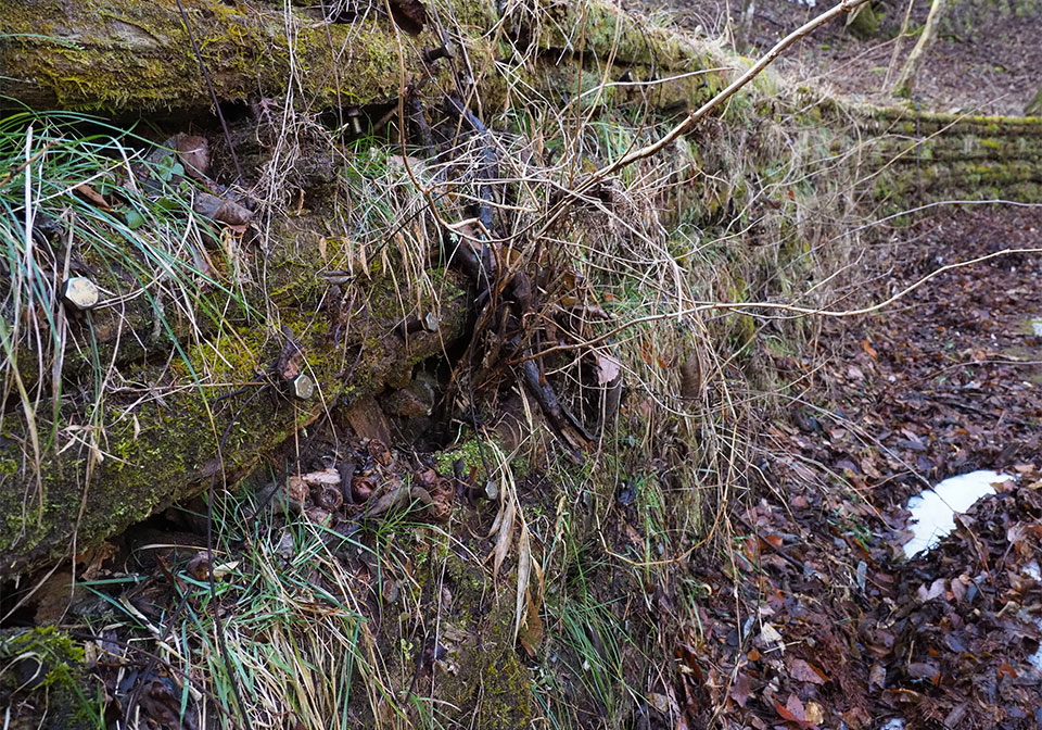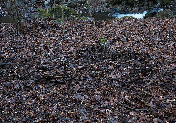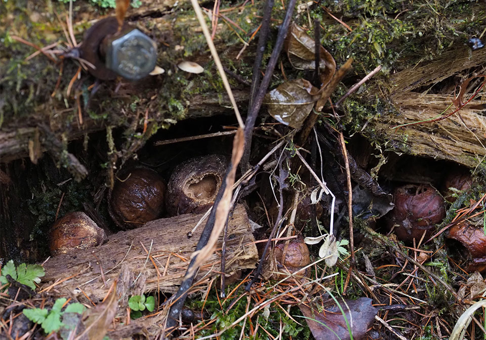 ある程度遡行した所で一度林道へと上がると、盛り土が崩れないように木を積んで作られた擁壁の隙間に、西さんがオニグルミの実を見つけた。