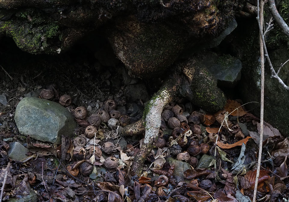 そういってうれしそうに写真を撮っている。隙間に詰め込まれていたクルミにはちゃんとネズミがかじった穴が開いていた。見ると近くにはちゃんとクルミの木があって、そこから離れると隙間に詰められたクルミの数も減っていく。ネズミなりにちゃんと効率のよい場所を選んで利用しているのがよくわかりうれしくなる。