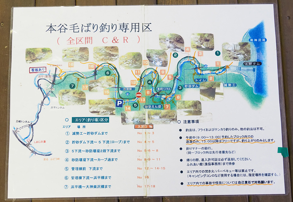 松元 ようするに上流はダムで仕切られていますし、通り抜けできないんです。なので入口さえ管理すれば、そこにまた戻ってこなければなりませんし、魚を持っていく人もいないだろうと。ちょうど平成14年の頃にそんな希望を釣り人の方々からいただきまして、その頃、ダム工事のによる立ち入り禁止区域は平成18年にはなくしますという通達があったんです。3~4年後には本谷が戻ってくるという時に、ちょうどその区間の利用方法のイメージが固まってきたんですね。私はそこを一般区として開放したら一年でお終いになるだろうと思ってましたから、違った管理の仕方を試したいと思っていたのですが、話はさらに進んで「毛ばり釣り専用区というのはどうでしょう」という流れになってきたんです。そこに区間分割や予約制などの仕組みを取り入れてみたらどうだろうかと。それを規則にするのはどうでしょう?と県に相談をしてみたら「釣り人からのクレームがなければ別に構いません」という答えでした。当時、クレームというのはこなかったんですね。「ぜひそういう釣り場も面白いのでお願いします」という声ばかりでした。区間分割や予約制で釣り場を独占できるなんて、今までにはなかったスタイルなので期待が大きかったのでしょう。そして平成18年、この年は夏場の2~3カ月だけの短期限定で「本谷毛ばり釣り専用区」がスタートしました。