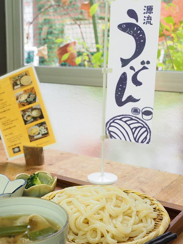 前編で紹介した大血川渓流観光釣場の名物「源流うどん」は、奥さんの吉田みね子さんが、ご主人のお父さん、初代の吉田和平さんから引き継いだ強いコシとつるつるのノド越しが特徴だ。