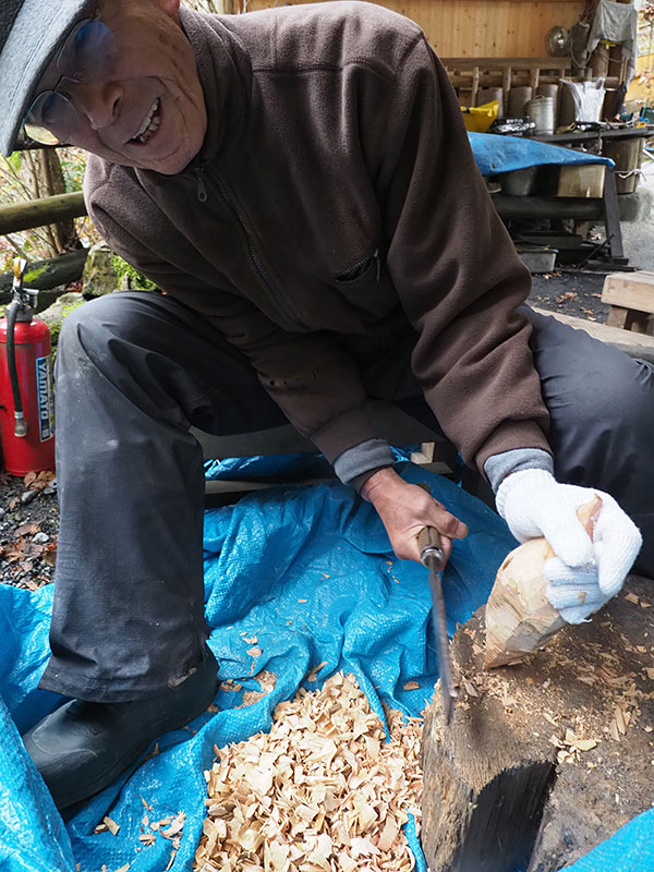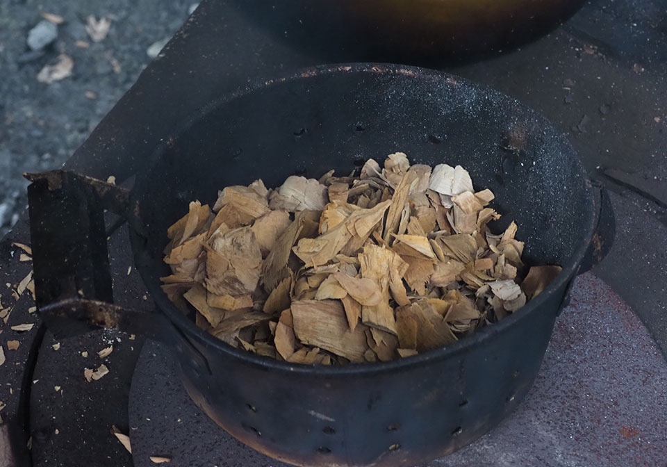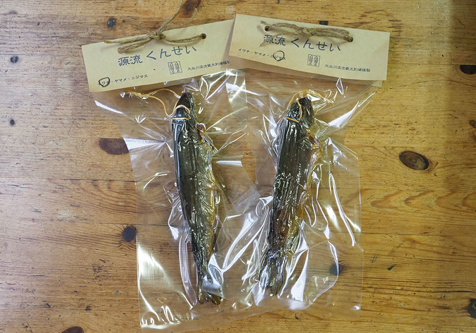 燻製の醍醐味は味もさることながら、その香りだ。真一さんの源流くんせいは、近くの山で採れるヤマザクラから削り出したスモークチップの香りにワイン樽の香りがほのかに添加され、さらに「隠し香」として爽やかな香りのクロモジが加わるこだわりよう。クロモジは魚の腹を開く支えに使うだけでなく、少しヤマザクラに混ぜて「追い香」を付けたりもする。「かつてはホオの実にこだわったこともあったんですけど、香りが安定する反面、少し苦みが出るんです。それが嫌で使わなくなってしまって……」