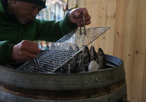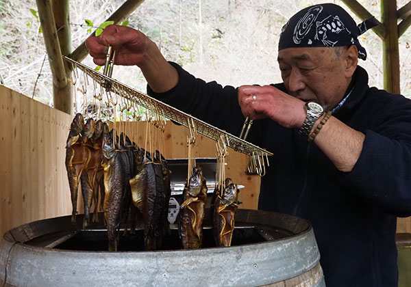 先代のお父さんお母さんから奥さんが引き継いだ源流うどんは、近くの山や畑で採れる山菜や野菜が添えられる、渓谷部ならではの名物となった。そこに加えここ数年、もうひとつの名物が人気を上げている。それは真一さん手作りの「源流くんせい」だ。イワナ、ヤマメ、ニジマスを、ワイン樽と桜チップを用いたこだわりの独自製法で燻す山の幸。実は今回、私が取材にお伺いした理由のひとつに、この燻製があった。ワイン樽で燻すところを見せてもらいたかったのだ。