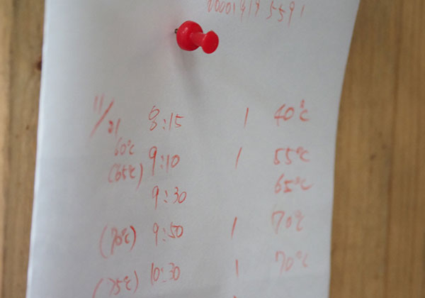「味と香りを付けるための、いわゆるソミュール液ですよね。皆さん、ここに独自の割合でハーブを加えたりして、オリジナルの味を出しています。うちの場合は、まず最も多く入れるのがローズマリー。そして月桂樹。さらに山椒も少し入れてます。あと粒と粉のブラックペッパー。これをブレンドして15%の塩水になるように調整して一昼夜漬けこみます。漬けこんだものを取り出したら、まず一回、川の水で洗います。さらに浄水で洗って水切りをして、キッチンペーパーで水気を取って、吊り下げるためのひもと、腹を開くための串を打ちます。今度はそれを一晩干してから燻製に回す、という工程ですね」