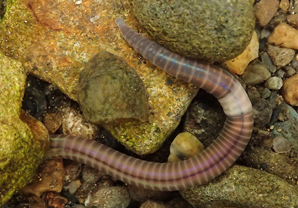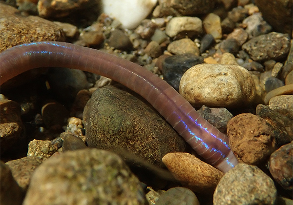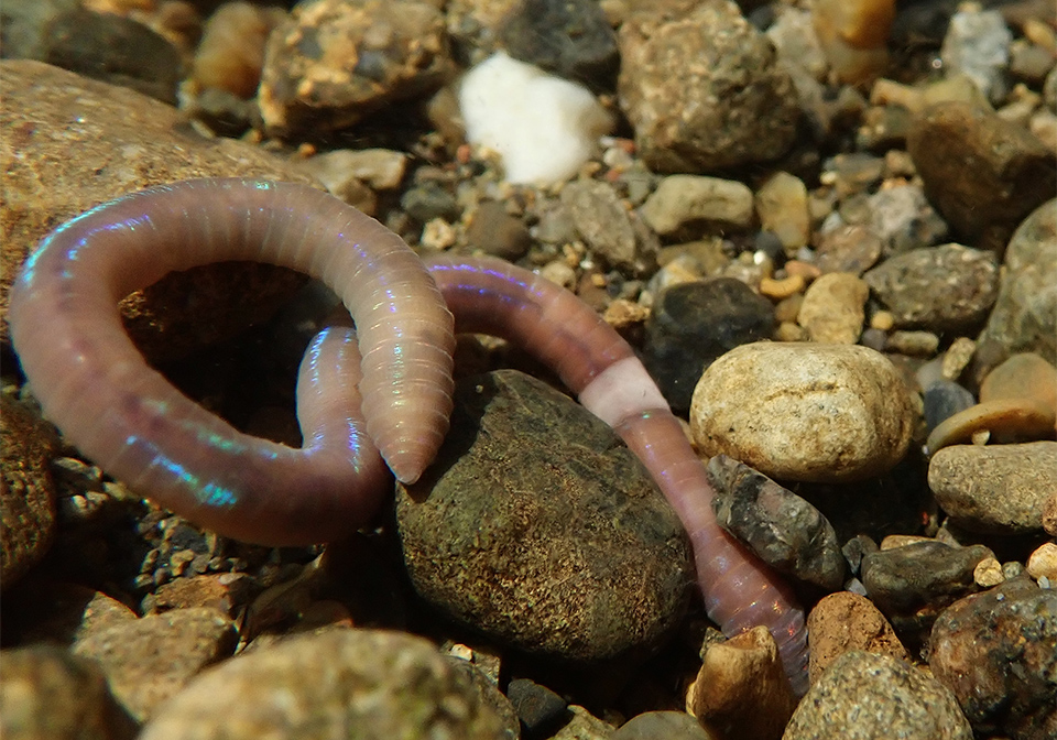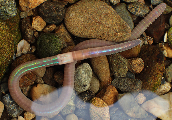 川底から美しき虹色のミミズが現われた!
