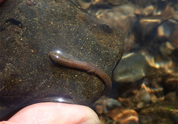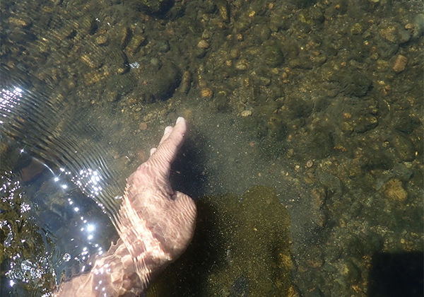 では、今見たきれいなミミズも陸地から流されてきたのだろうか? それにしては弱った様子もなく、見た目も健康そのものに見えた。なにより川底に戻したミミズは、そのまま流れに抗しながら口先で石と石との間を探ると、するすると潜っていってしまったのだ。