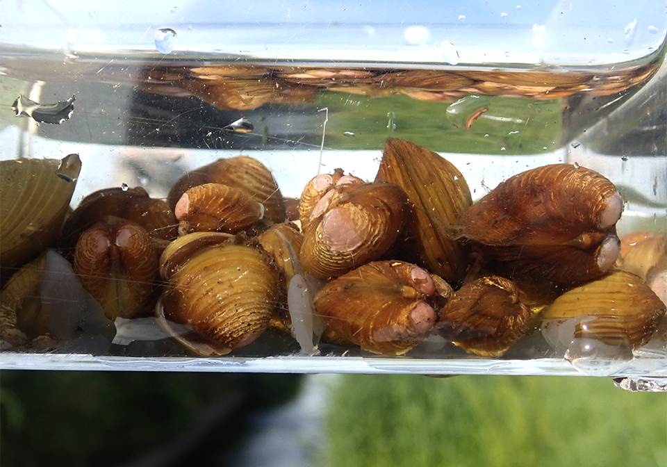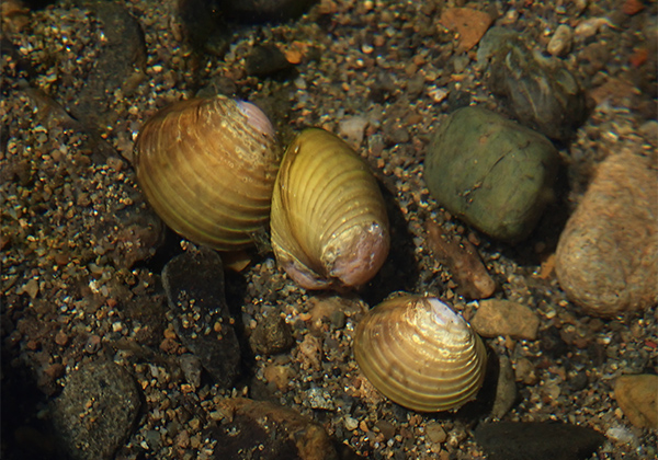 産卵後のためかボーっとたたずんでいたニゴイを横目に分流を上る。やや浅くなった分流の入口では、適度な流れが砂礫底を洗っている。いるならばここだろう。そう思って少し掘ると、いきなり黄色い殻のシジミが2、3個現れた。さらに掘ると、大きさの異なるシジミを多数見つけた。そこはシジミの溜まり場だったのだ。