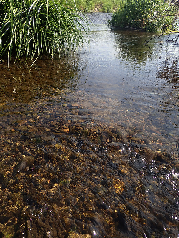 しばらくニゴイの産卵場の周辺を探してみたが、見つかるのはシジミと、「黒川虫」と呼ばれるヒゲナガカワトビケラの幼虫だけだった。ミミズがいたのはたまたまなのか? 他にこの川で、似たような場所はないものか……。少し上流の小さな中洲がつくる細く浅い分流が頭に浮かんだ。小石と砂利と砂。緩く浅い流れにはシジミがいそうだし、シジミがいる所ならばミミズだっているかもしれない。