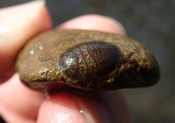 面白いようにシジミを掘り集めていると、細くうねる姿が現れた。……いた。ミミズだ。しかも朝に見たものと同じく体には張りがあり、虹色にギラギラと輝いている。「ずいぶんとマッチョなミミズだな……」と思い、自分の中で「マッチョ虹色水生ミミズ」と名付けることにした。さらにもう一匹、今度はまったく異なるミミズが現われた。体表がゴカイかイソメのようにギザギザで、頭が細長く、しかも頭の近くに巻かれたハチマキがオレンジ色だ。なんだこれ? まったく初めてみるユニークなこのミミズには「オレンジハチマキ水生ミミズ」という名前を与えた。