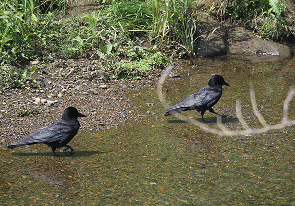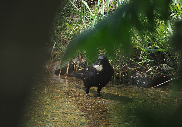 川底のミミズを掘るようになってから、とあることに気付いた。私がミミズを掘っているのは緩い流れのある浅瀬だが、そんな場所を気にしながら川を歩いていると、川底をついばんでいるハシボソガラスの存在が目につくようになった。おそらくそれまでもいたのだろう。目に入っていても見ていないなんてことはしばしばで、この時もカラスの様子を観察して、なぜ今まで気づかなかったのだろうと驚いた。カラスは浅瀬の水に浸かりながら川底の石を器用にひっくり返しては黒川虫を、そして川底のミミズを引っ張り出すようについばんでいたのだ。