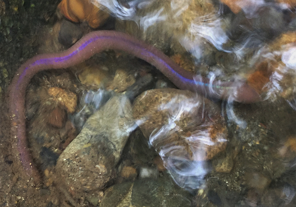 それは流れてきたわけではなく、紛れもなく目の前の川底から私が掘り出したものだった。グネグネと激しく体をS字によじったかと思うと頭の先を細長くすっと伸ばし、小石と小石の隙間に潜っていきそうになった。急いでつまみあげてみると、ミミズのイメージにあるヌメリ感はなく、思いのほかスベスベとしている。そして体はムチッと張りがあり、太陽の光を受けると虹色の帯がメラメラと体表を揺らめいているではないか。