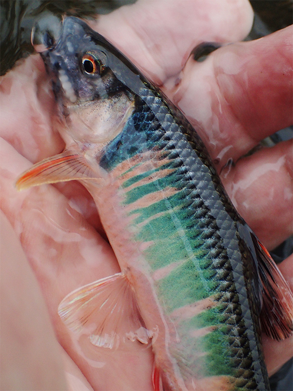 この川のアユ釣りはドブ釣りに限られる。石のコケを食むようになると芽生えるナワバリ習性を刺激する友釣りとは異なり、ドブ釣りとはキラキラした毛針のような枝針に食いつかせる釣法だ。アユは小さいころは流れてくる虫などを食べる動物食なので、ドブ釣りは適しているが、コケ食に変わるとやや分が悪いのではないか。そんな心配をしながらハグロトンボの舞う川辺で半日竿を振ってみたが……見事にボーズ。蓼酢で食すアユの塩焼きはお預けとなった。その代わりにオイカワが釣れた。オイカワもニゴイやマルタウグイ同様、この川の砂利底に産卵するコイ科の魚だ。ただ、産卵期は盛夏となる。