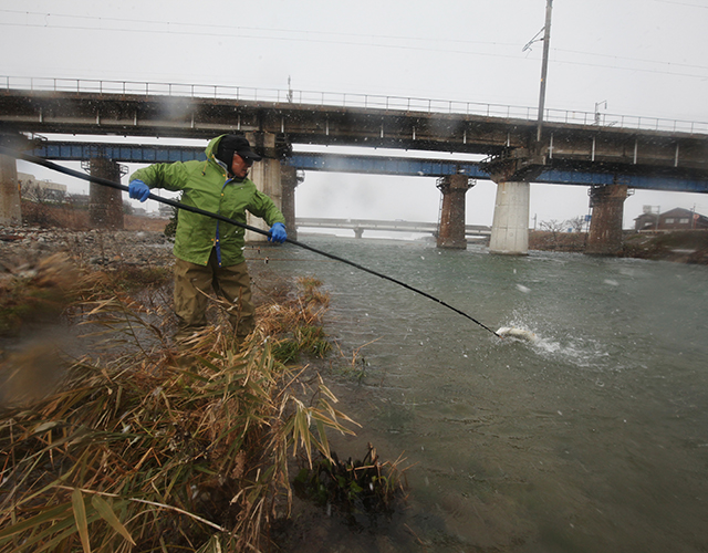 一瞬の出来事だったため、しっかりと写真に押さえることはできなかったが、カギで掛けてから引き上げるまでの躍動感が目に焼き付いた。サケとの頭脳的な駆け引きもさることながら、大きなものだと10㎏を超えるサケの躍動を竿で一身に受け止める感覚は、コド漁ならではのダイナミックな魅力と言えるだろう。体中に伝わる生命の躍動感。これもまた、釣りと共通した魅力だと感じた。