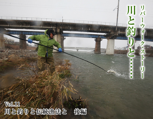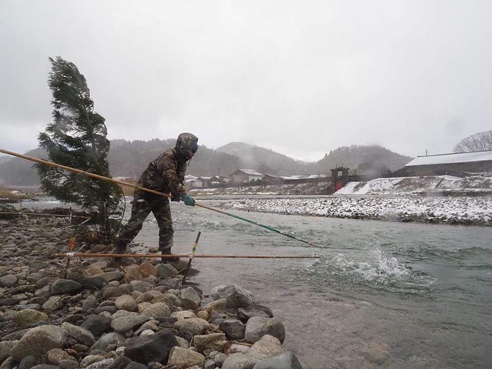 前日に聞いた組合長の言葉が蘇る。サケ漁を行っているのは府屋で約20名、大川全体でも60名。300年を超える伝統漁の歴史は今、個人の楽しみに委ねられている。伝統文化を守ることには意味があるのだろう。だが、できることならば暮らしと結びついた自然な営みのままでいて欲しい。楽しいからやる、というのはとても自然な動機なのではないだろうか。光治さんの流れるような動作を見ながら、そう思った。