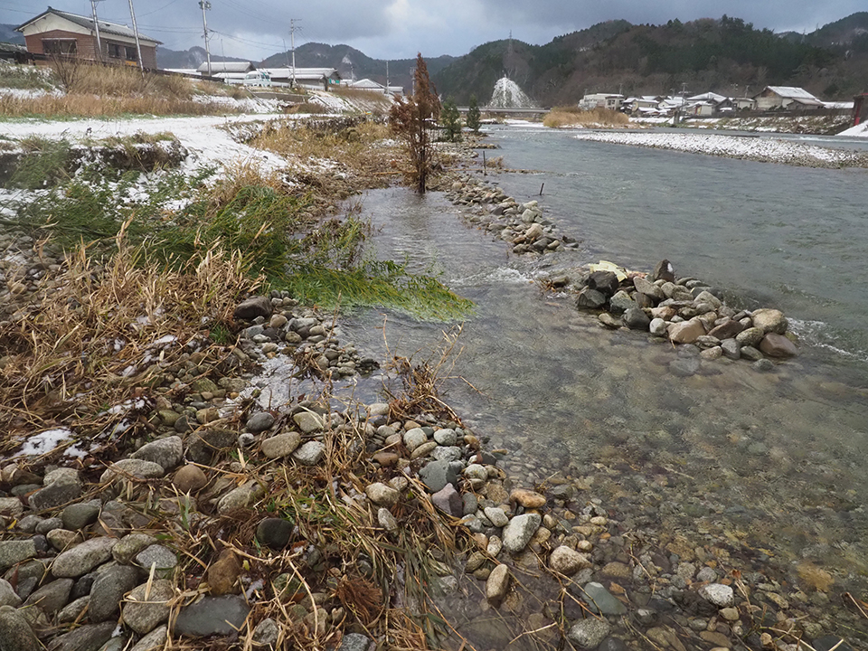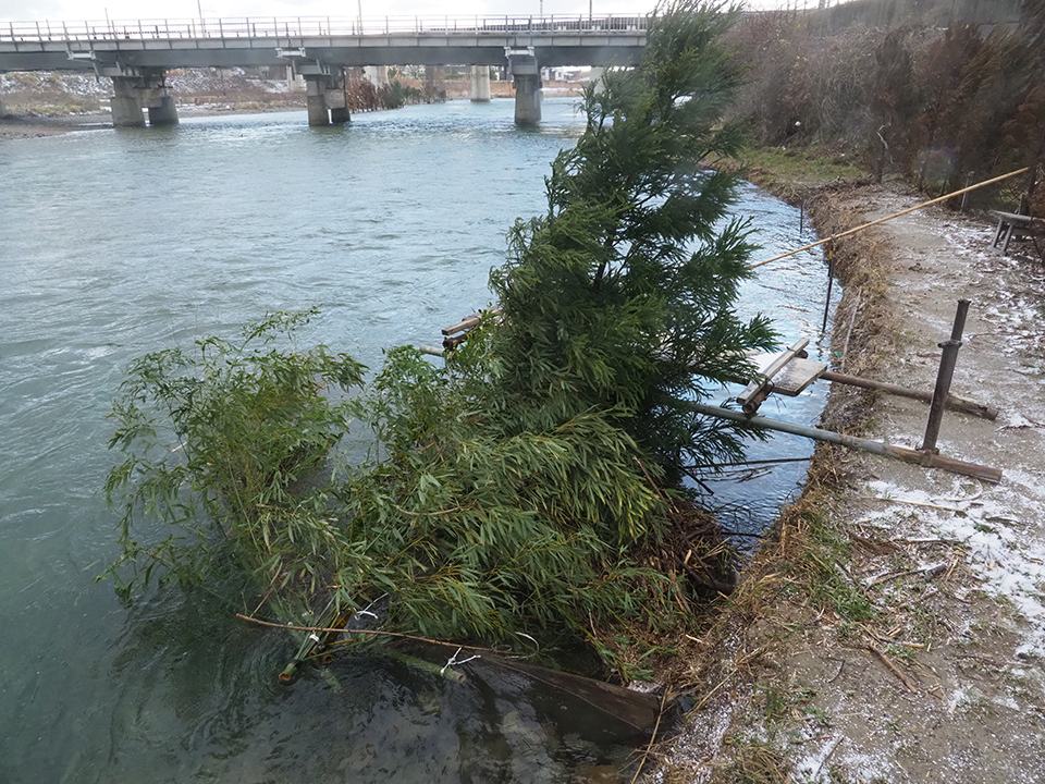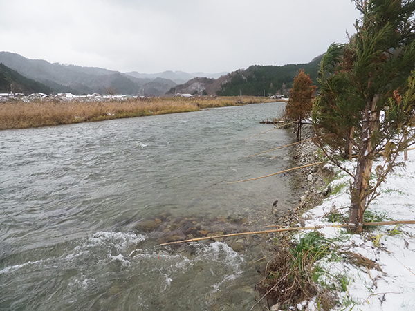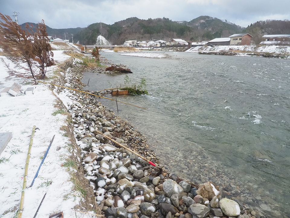 今日も漁は難しそうだ。だがコドはある。雪風舞う中、設置されているコドをひとつずつじっくり観察する。まるで三面川で知られる「種川」のような分流が設けられているものもある。洗われた砂礫が並ぶ棚のような浅瀬は「ホリ」と呼ばれるサケの産卵床を模して作られたものだろう。強い流れには笹のシダが水中に束ねて寝かされ、サケが安心できる休み場所となっている。ひとつひとつの仕掛けがサケへの問いかけだ。それは自然との問答であり、楽しさは釣りとも共通するものだろう。