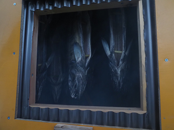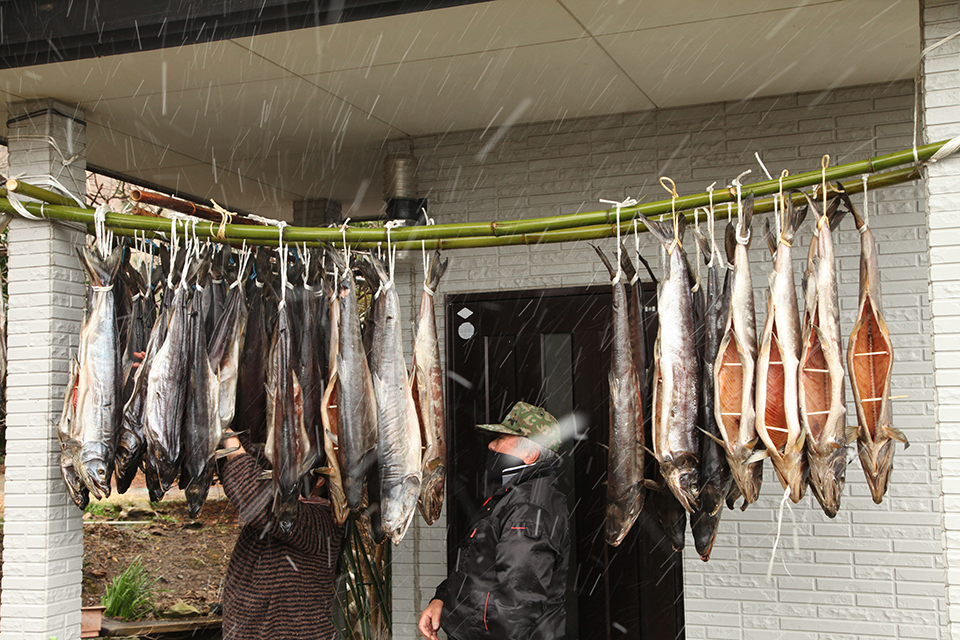 漁獲したサケは採卵に回す以外は基本的に自家消費もしくは親しい人へのおすそ分けとなる。塩引き作りは冬の楽しみにひとつだという。平方組合長もまた、自分の塩引きを作っている。海沿いに住む友人の家の軒先に吊るした今年の塩引きを見せてもらった。