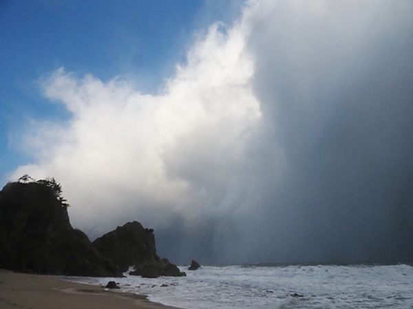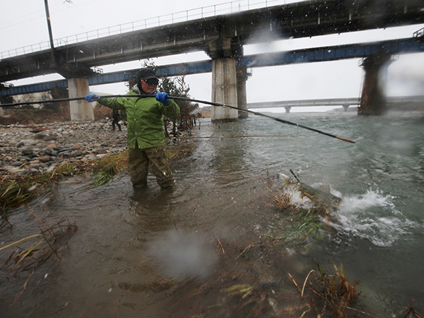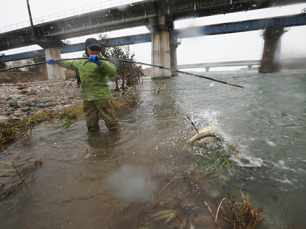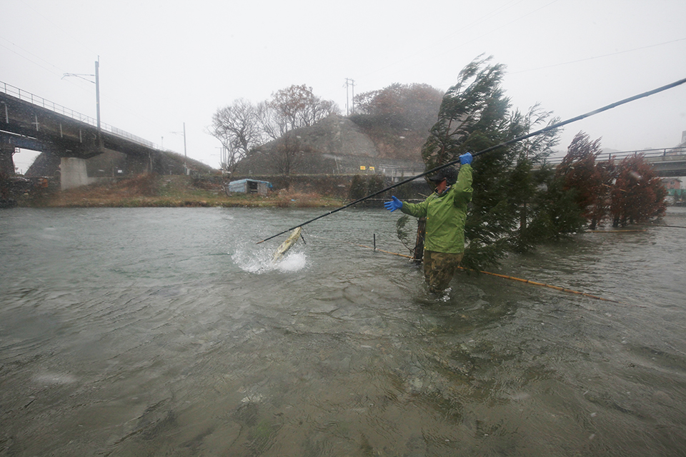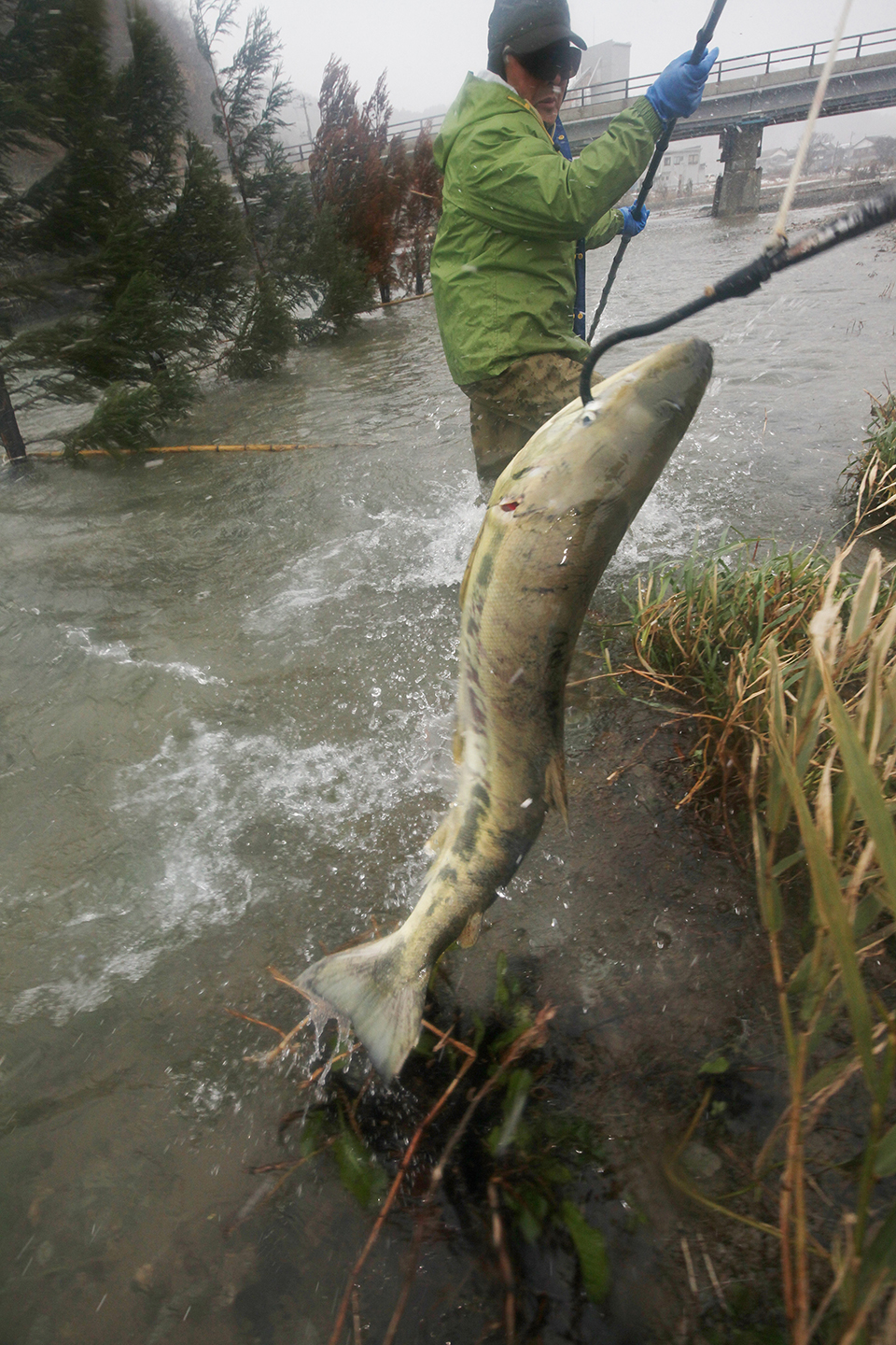翌朝、7時にホテルを出ると一路、30㎞先の大川を目指した。前日の組合長の話から、サケが獲れるシーンを目にすることは、半ば諦めていた。大川に向かう道中、強風に加えて大粒のヒョウがフロントガラスにバチバチ当たる。川辺に到着。不安定な大気の下、川に設置されたコドを見た。杉の木が斜めに倒れんばかりに風になびいている。