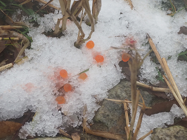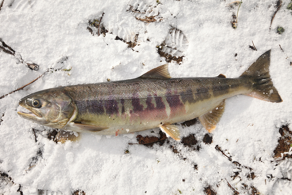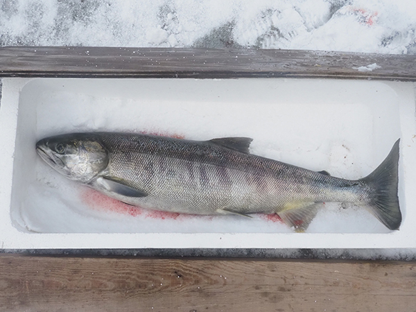 急いで走り寄ると、小さなメスのサケだった。もうほとんど卵を産み終えた後のホッチャレ(放っちゃれ、の意味からつけられた産卵後のサケの呼称)だったが、漁獲されたサケを見ることができた。さらにもう一匹、今度はふっくらと丸みを帯びた大型のメスが引き上げられた。雪面に卵が飛び散った。