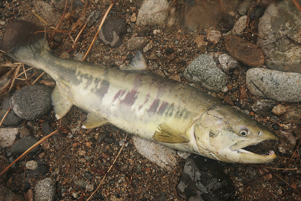 「最初にカギで引っかけたサケの口とエラの所にひもを通して、泳がせておくんです。オスザケをオトリにするとメスザケが寄り、メスザケをオトリにするとオスザケが寄る、というわけです。コドはサケの通り道でもありますが、浅い所は産卵場にもなりますから、そういう場所は川底を洗って砂を飛ばし、サケがより産卵しやすいように手を加えることもあります。サケはペアになると産卵行動をしますから、それを見ているのも飽きません。逃すともったいないので、結局はカギで引っかいてしまうんですけどね(笑)」