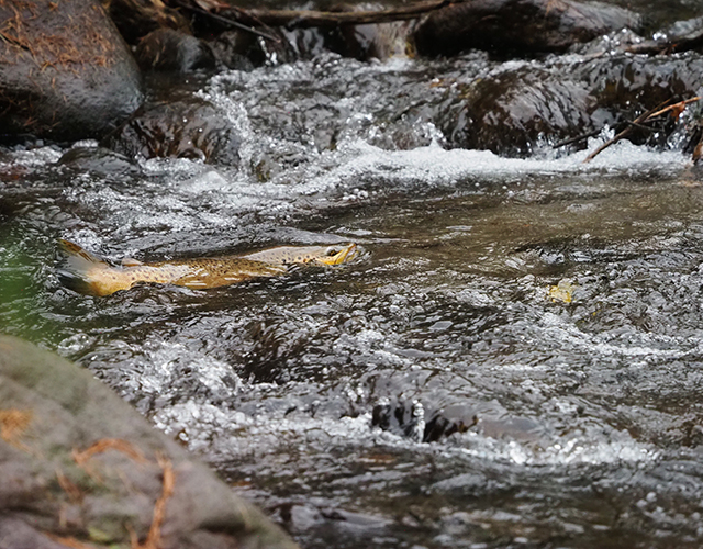生涯に一度海から遡上して産卵をすると生涯を閉じるサケやカラフトマス、それにホンマスの仲間であるサクラマスなどは、遺伝子にプログラミングされたような強い不可逆性を帯びた産卵行動を見せる。川底の砂利を掘るメスの尾ビレはボロボロになり、産卵終期には中の骨が露出するほどだ。遡上にも一心不乱の勢いを感じる。対してブラウントラウトやイワナは複数年産卵を行う。中禅寺湖のブラウントラウトを見ていると、一心不乱というよりも、もう少し遊びがあるというか「今年がだめなら来年があるさ」というような気楽さを感じる。いや、自然界で生命を繋ぐ行為に気楽さなどないのかもしれないが、それぞれの個体ごとの行動に「己の意思」を感じてしまうのだ。たとえば、上流へ行ったと思ったら、一気に下流へと流されていくのを楽しんでいるようなやつがいたり、ほとんど水面から体が出てしまうほどの浅瀬で休んでいるようなやつがいたりする。