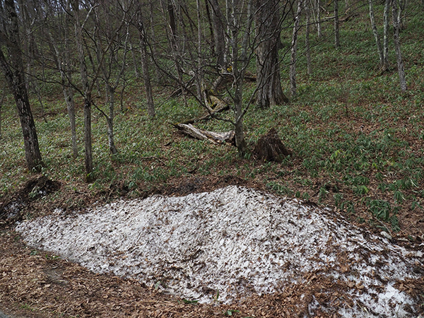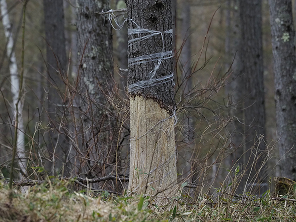 シカによる林床の食害は、以前よりも減ったようにも感じるが、それでも角を研いだ跡の残る木が所々に見られたり、草には食痕が目につく。それよりもカラマツの幹に巻かれた白いテープが気になった。説明書きを見ると、クマやシカによる樹皮剥ぎ被害を防止するためとある。道路脇にはイノシシに掘り起こされたような跡も目に付いた。