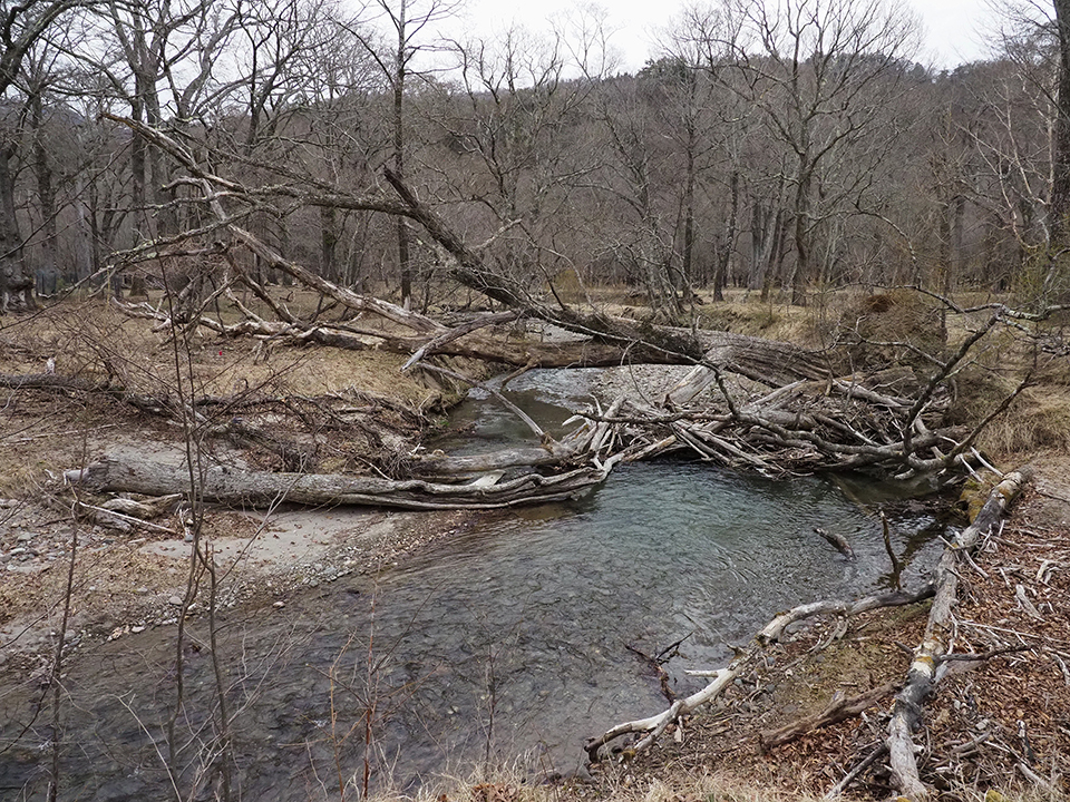 川の水量は昨秋よりも減っていた。雪解けはまだなのか? 冬から春に繁殖期を迎えるニジマスの産卵行動を見ることができないだろうかと淡い期待を抱いていたが、産卵床らしきものもない。カワガラスが石の上でピッと鳴いて、矢のように水面ぎりぎりを飛んでいった。水中を覗けば、昨年の秋に産卵したホンマスやブラウントラウトの稚魚を見ることができたかもしれないが、水の流れが滞留する「たまり」には、姿を見ることができなかった。