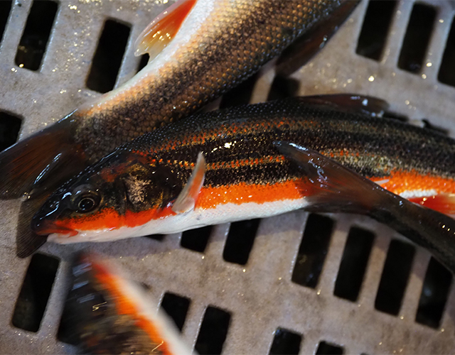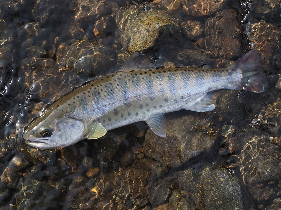 すぐさまミノーのトゥイッチを気持ち強めに入れて誘うと、手元に強い衝撃が伝わるとともに30㎝以上もありそうな銀鱗のヤマメが全身を露わに横っ飛びした。同時にルアーが弾き飛ぶ。デカい……まるでサクラマスだ。しばしボーゼン。落ち着いて場所を休める。そして再度ミノーを投じると、今度はしっかりフッキング。うっすらと側線上に朱点が並んだ25㎝ほどのきれいなアマゴだ。続けてもう1匹。